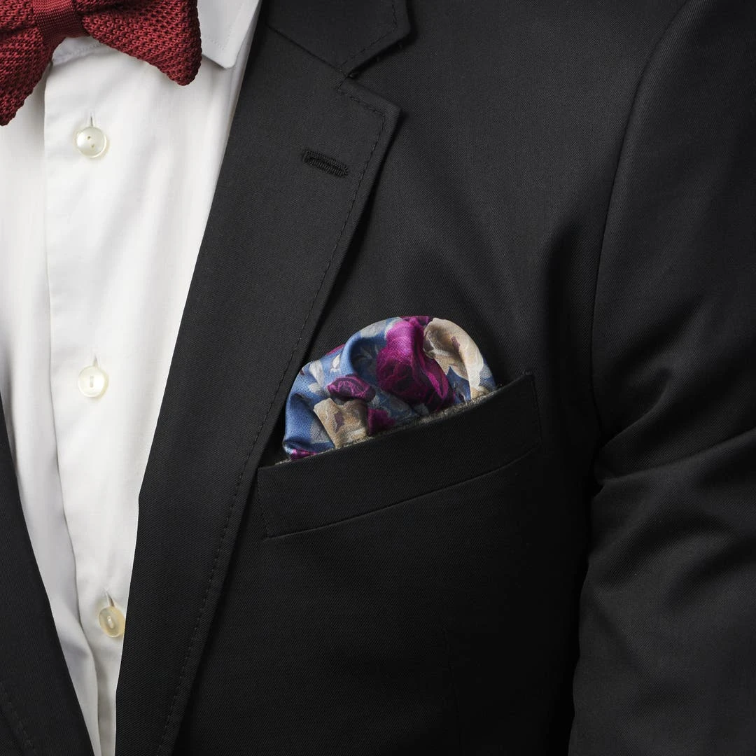 Un style romantique et des couleurs sobres font de cette pochette de costume en pure soie un moyen fantastique pour apporter une discrète touche colorée à tous vos costumes. Ses délicates tonalité de bleu, de bordeaux et de crème en feront le partenaire idéal de vos costumes les plus clairs ou les plus sombres.