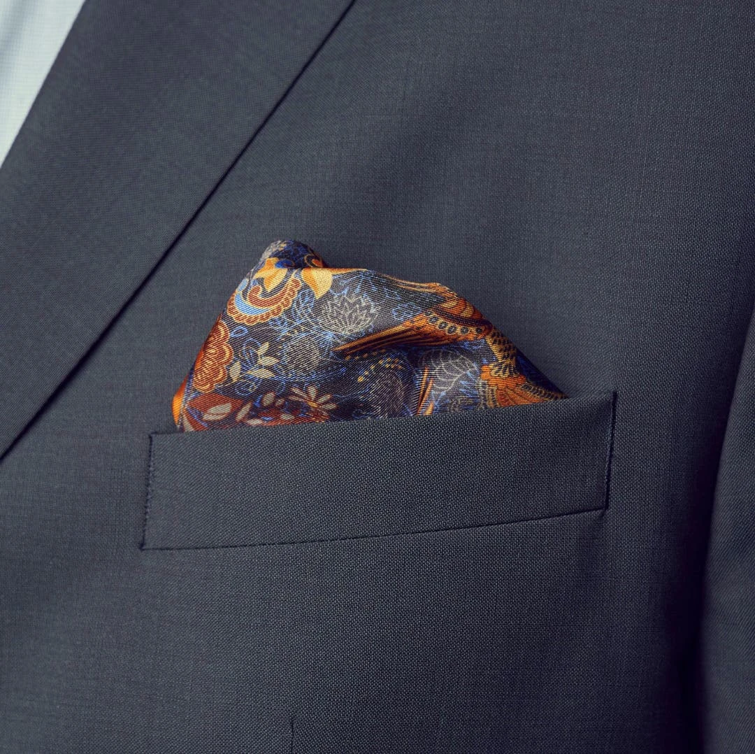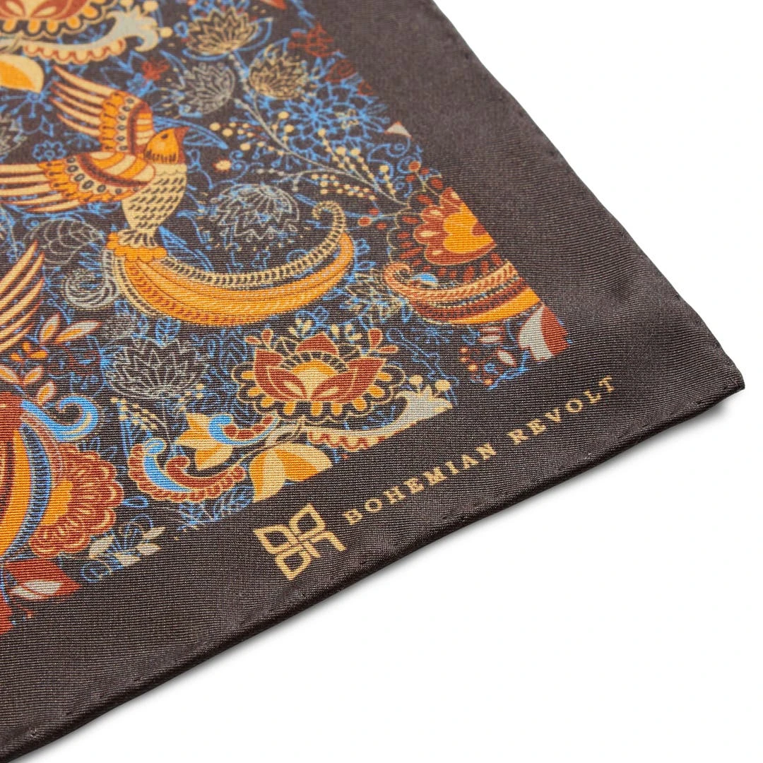 Parfaite pour donner de l’intérêt à votre costume bleu marine, cette pochette en soie brune est décorée d’un motif aussi complexe que détaillé, enchevêtrement de fleurs et d’oiseaux dans une explosion de couleurs. Le résultat : une pochette de costume qui se suffira à elle-même ou pourra accompagner vos cravates préférées.