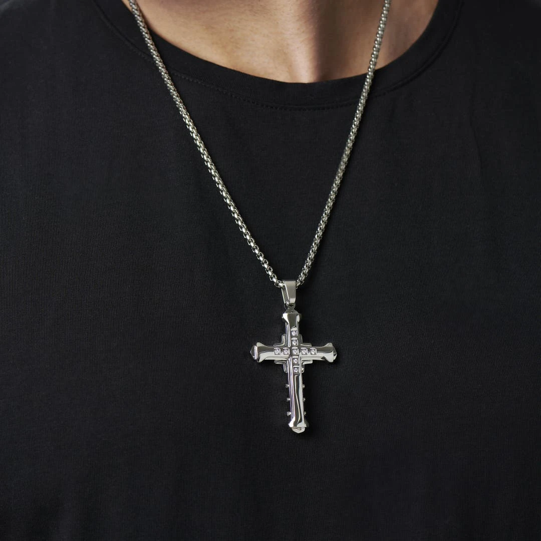 Fort Tempus Collier à Croix Chrétienne En Acier Stratifié Et Pierres.