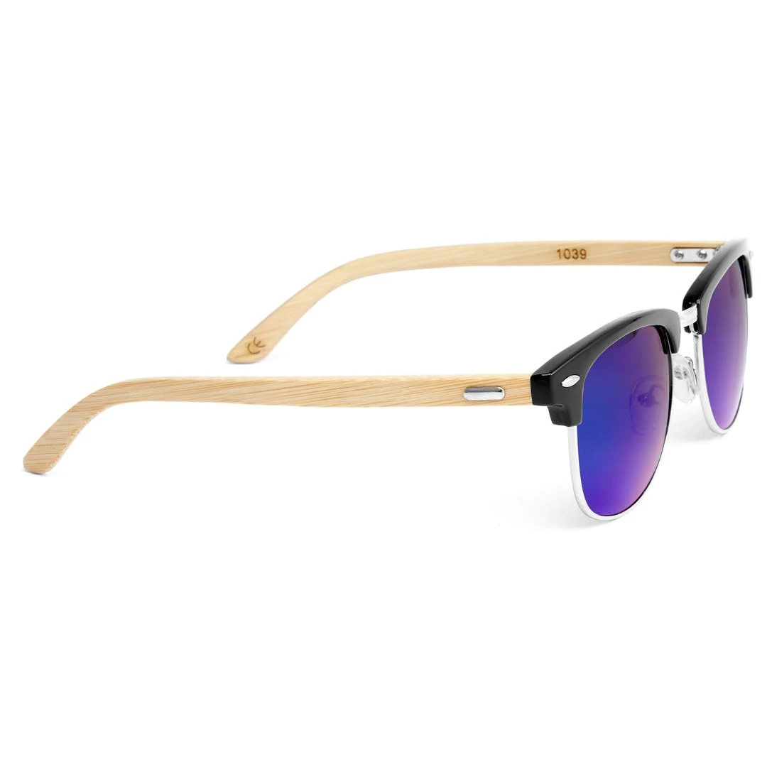 Monture noire et branches en bois de bambou faites à la main, le tout mis en valeur par des verres miroir bleu-vert. Une forme traditionnelle avec une petite touche moderne pour des lunettes originales. Le contraste de couleurs s’adaptera à toutes les couleurs de peau.