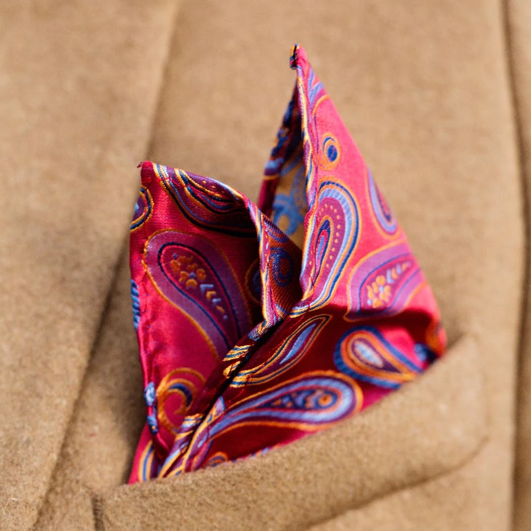 Entièrement cousu main, une fois plié et glissé à l’intérieur de votre poche ses détails montreront toute leur valeur. Il est composé d’un fond rouge foncé et de motifs jaunes et bleu roi.