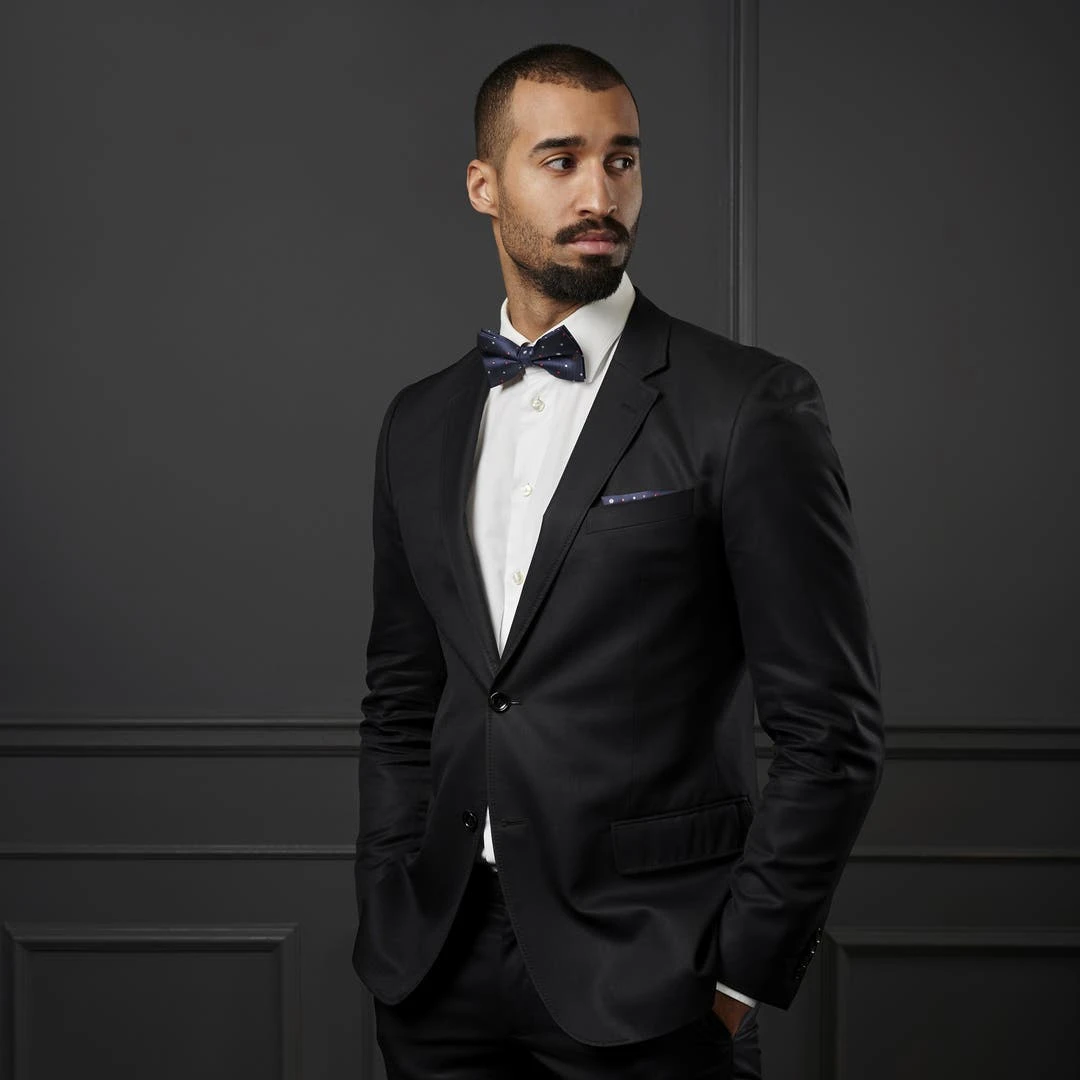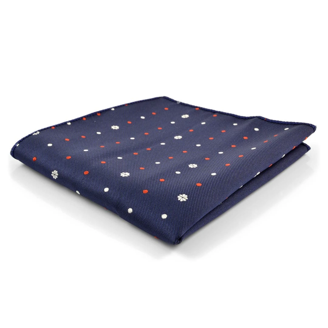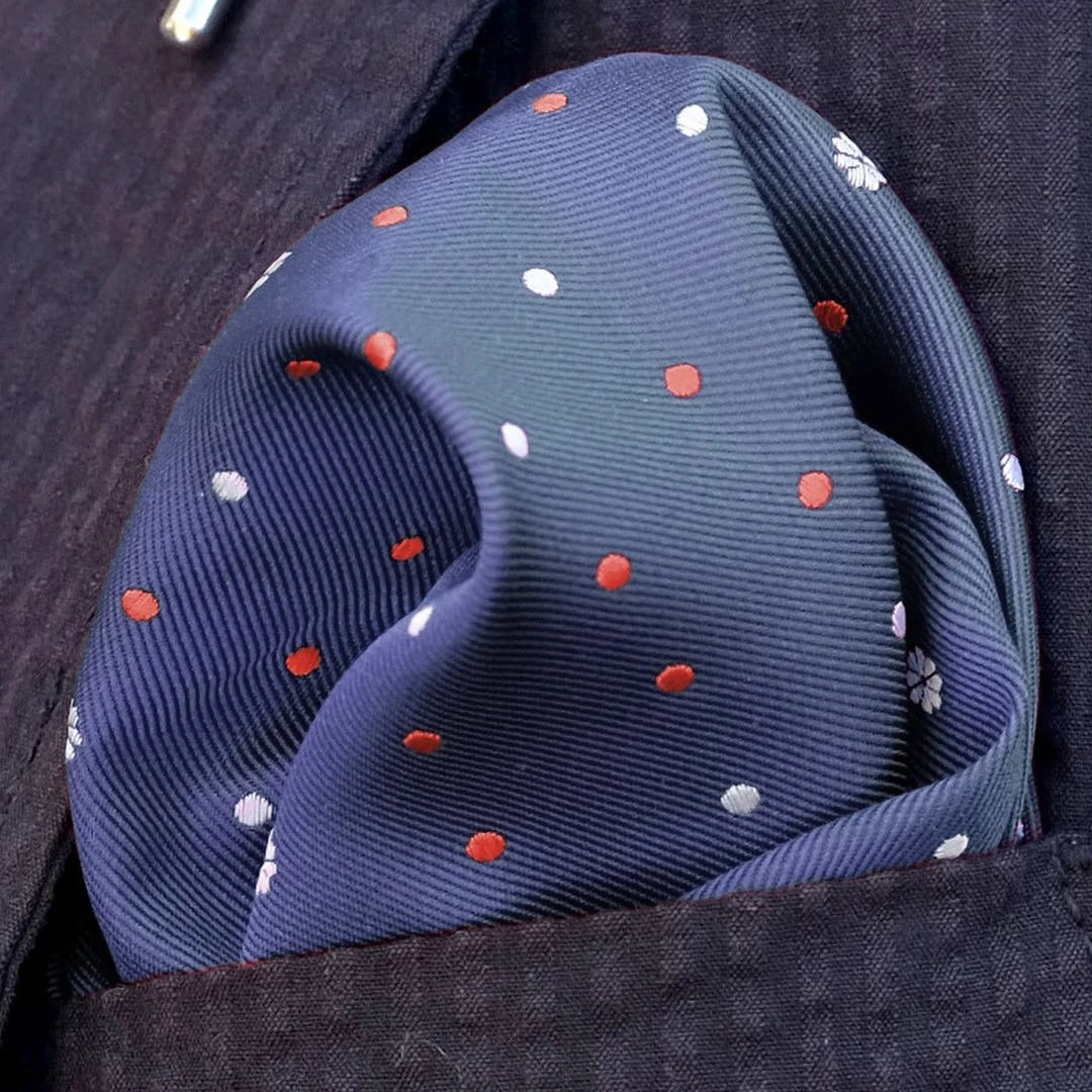 Une belle pochette de costume bleu foncé avec de petits points et un motif floral discrets.