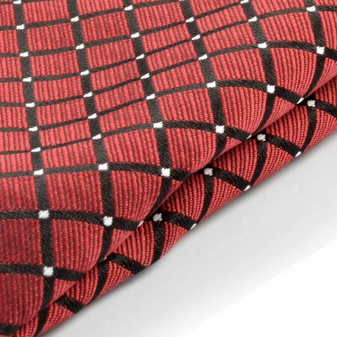 Une pochette de costume unique de couleur bordeaux avec un motif à petits carreaux noirs.