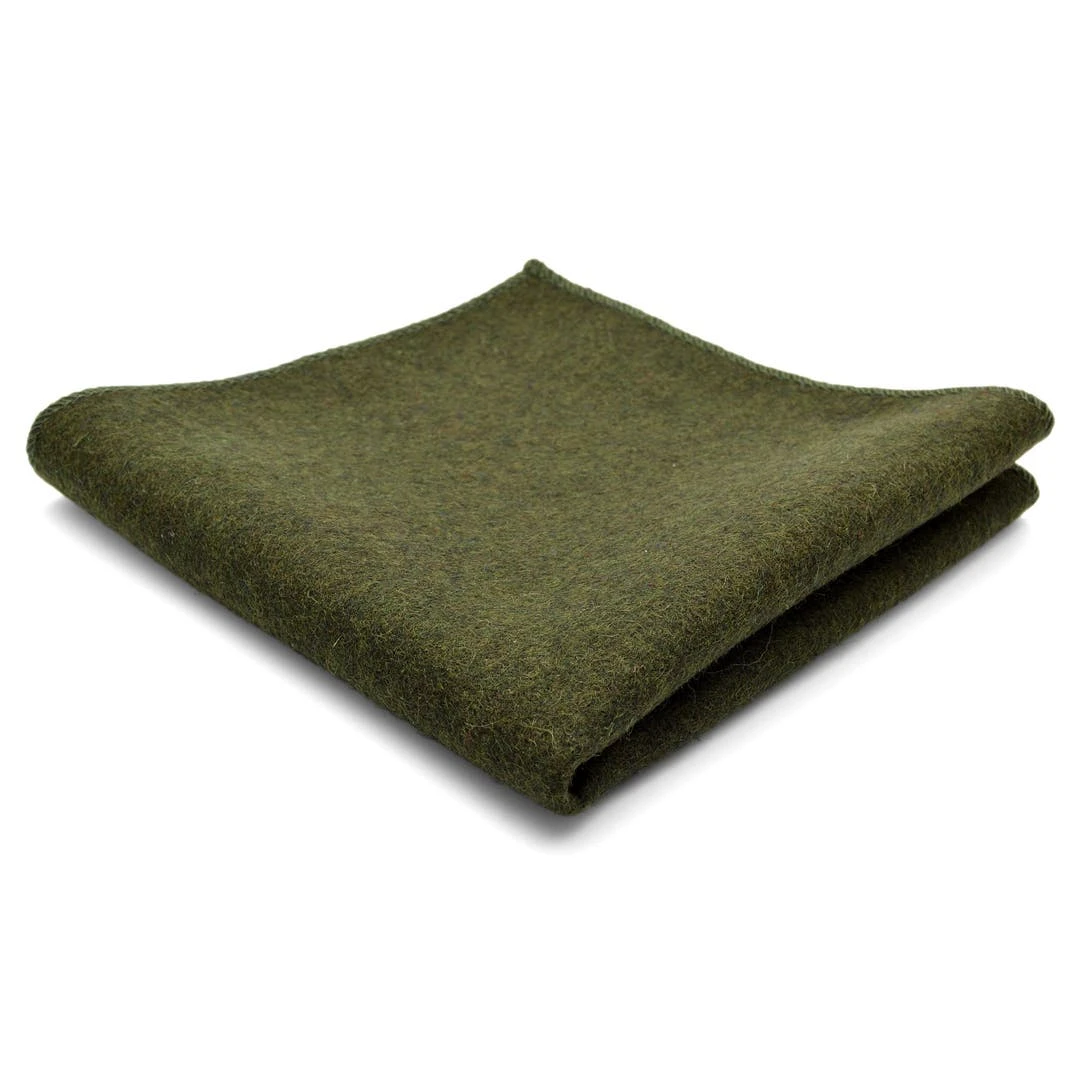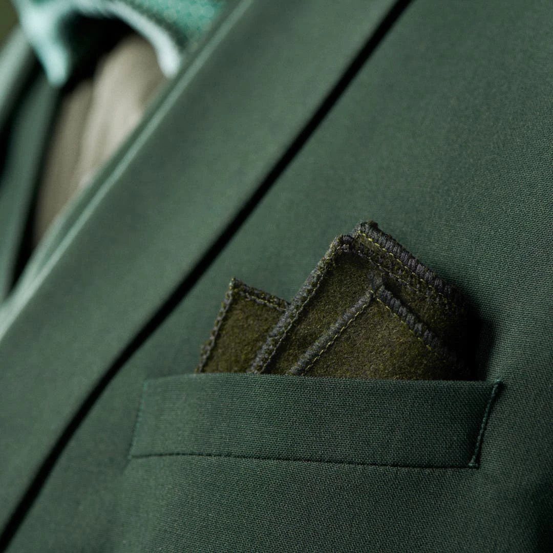Une magnifique pochette de couleur olive, 100% en laine avec des bords cousus à la main, pour lui donner une jolie finition.
