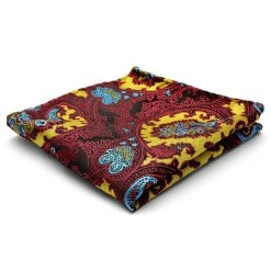 Ce modèle est fait à la main en 100% soie, il possède un fond bordeaux avec des motifs dorés et bleus, le niveau de détails est impressionnant. La soie a toujours été le tissu préféré des hommes pour la confection des pochettes de costumes carré de poche car il apporte une profondeur inégalable.