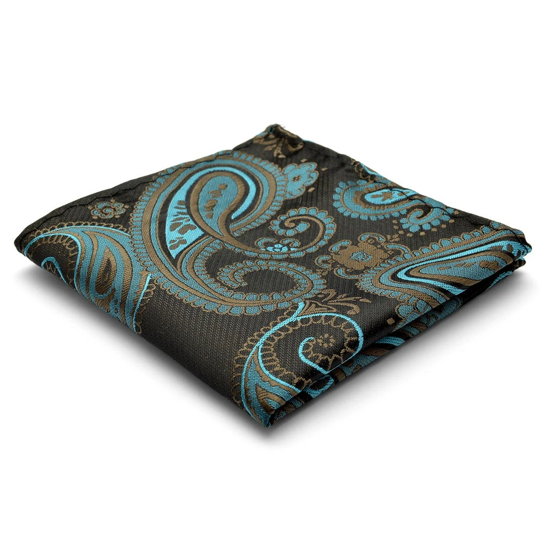 Un joli mouchoir de poche 100% soie. Il affiche un motif turquoise Paisley sur fond noir, moderne et classique à la fois