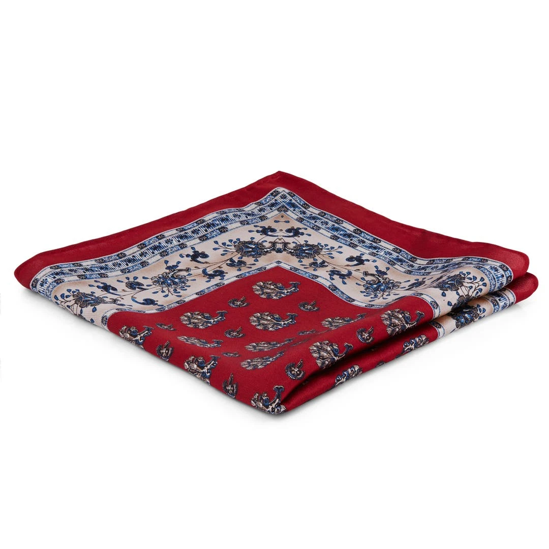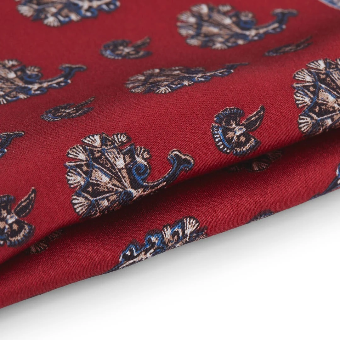 Ses tonalités de rouge, de bleu et de crème et ses motifs élaborés décorent une soie légère et aérienne qui sera facile à plier et replier, tout en restant très compacte – elle ne déformera donc pas la poche de votre veste. Les bords de cette pochette ont été cousus afin d’éviter qu’elle ne s’effiloche.
