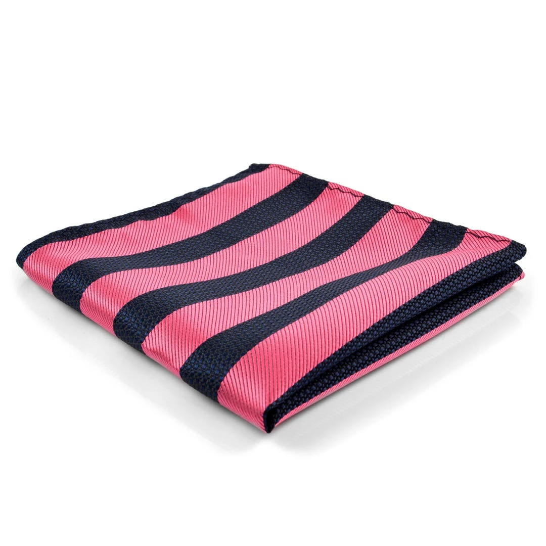 Cette pochette classique à larges rayures conjugue bleu foncé et rose.