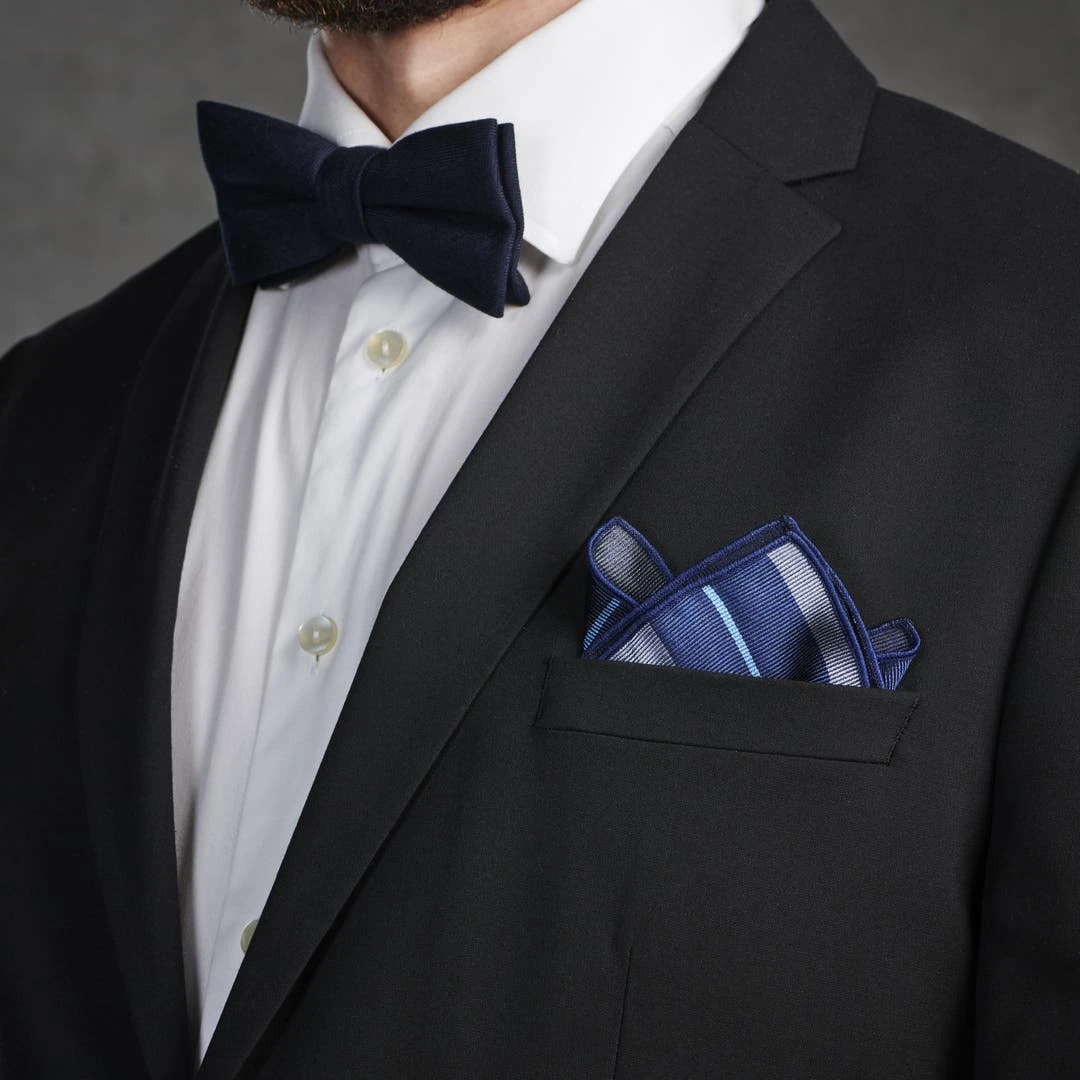 Les rayures bleu marine et grise subtilement contrastées de cette pochette de costume sont mises en valeur par de fines rayures d’un bleu vif éclatant.