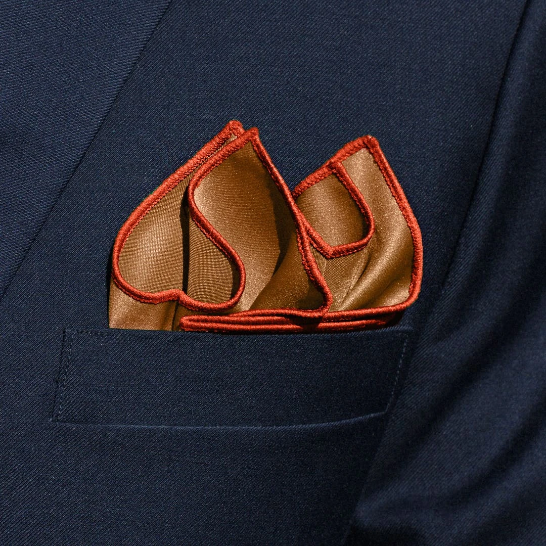 Une pochette de costume brun clair aux élégantes tonalités automnales, qui sera idéalement assortie à des couleurs contrastées.