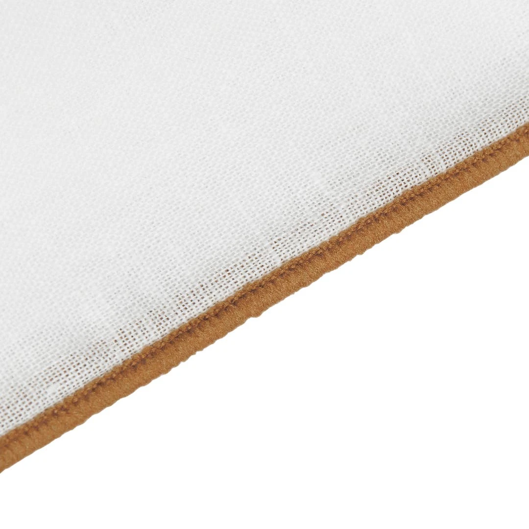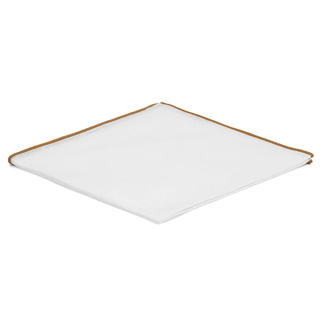 Cette pochette de costume arbore un look délicieusement rétro grâce à sa confection en lin blanc décoré de bords bruns renforcés.