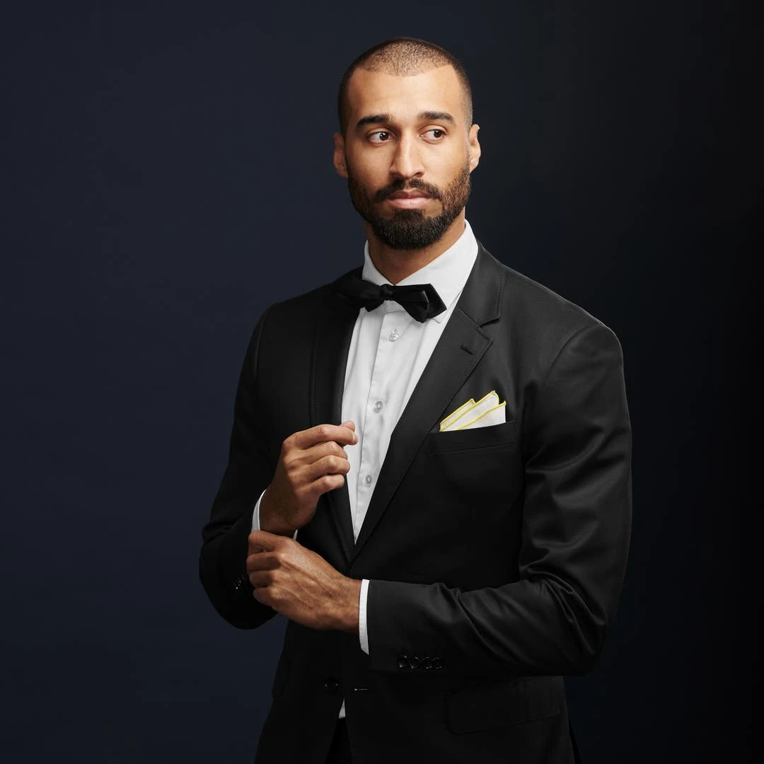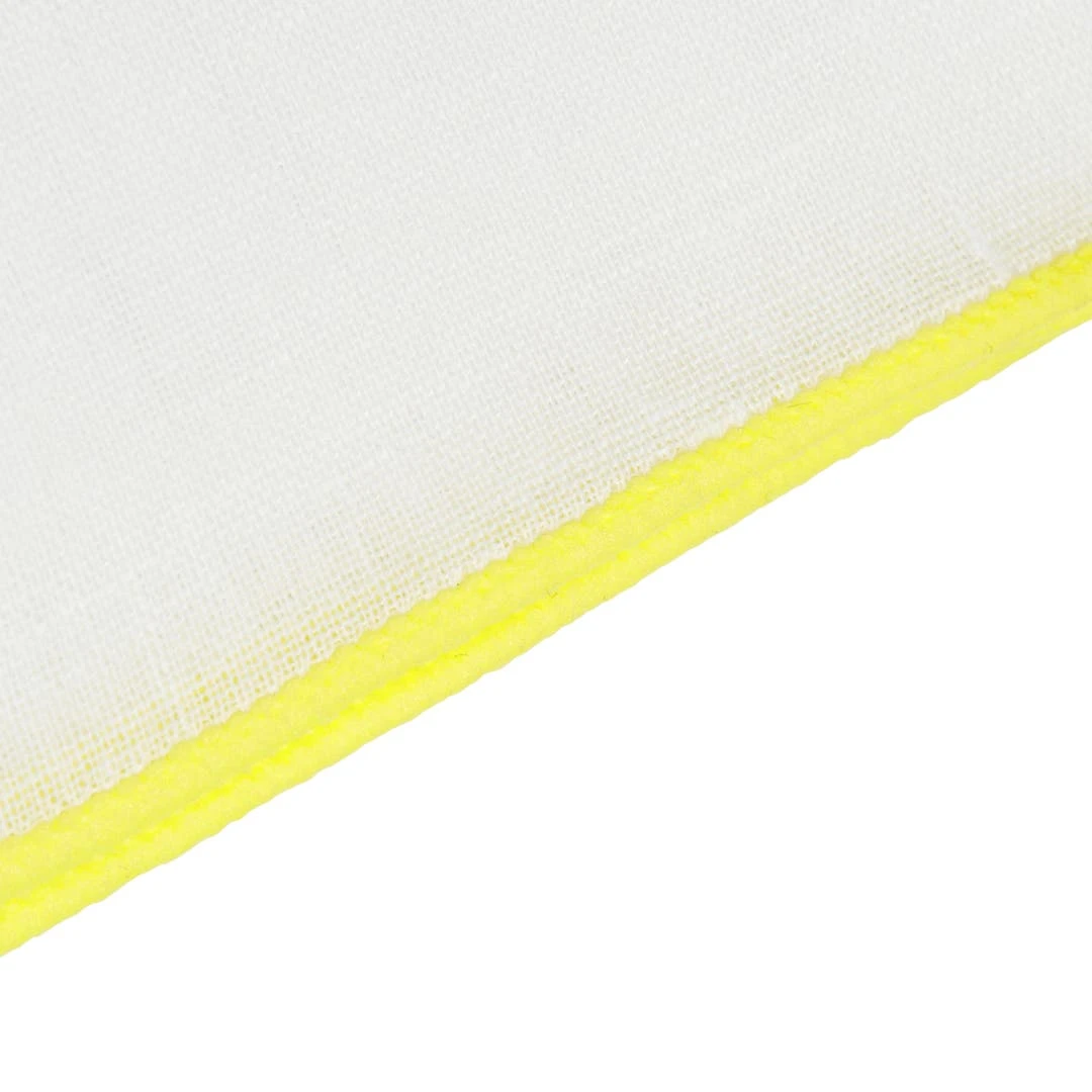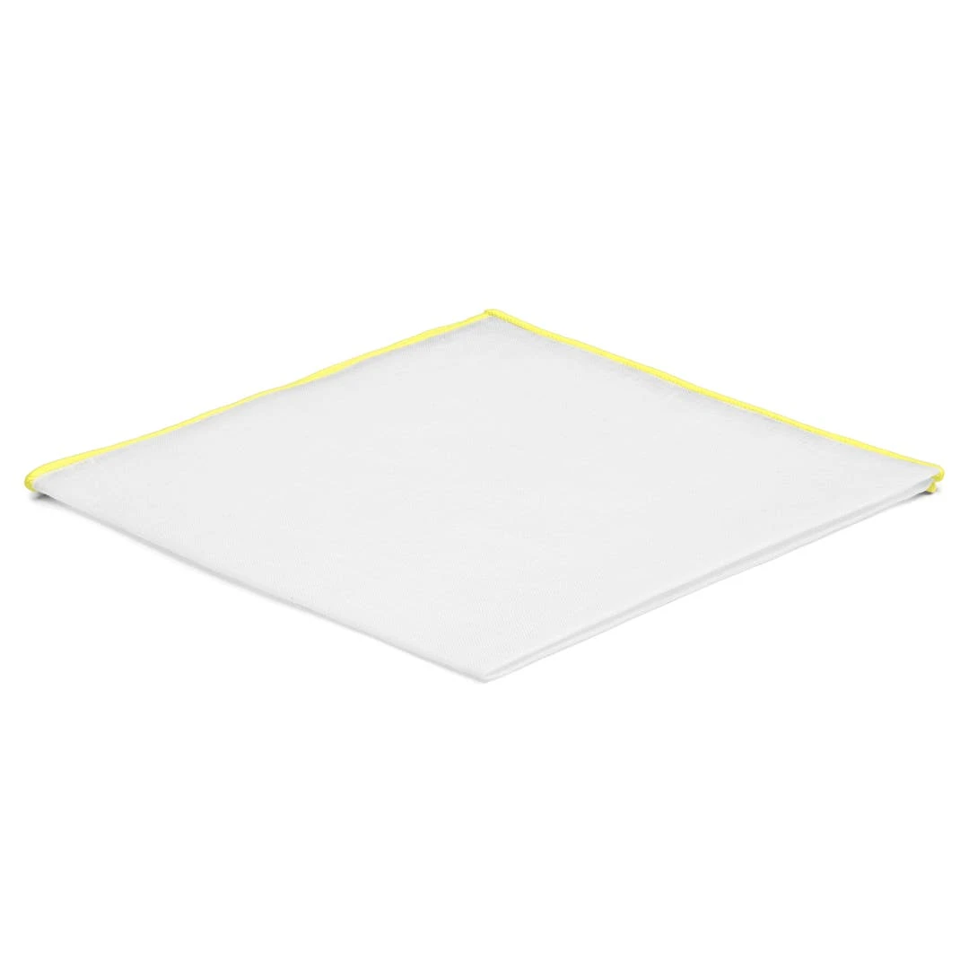 Cette pochette de costume en lin blanc est brodée de bords jaune clair qui la rendent belle à croquer.