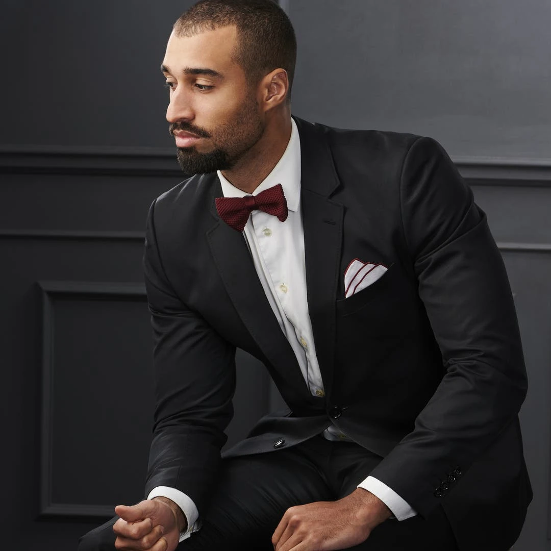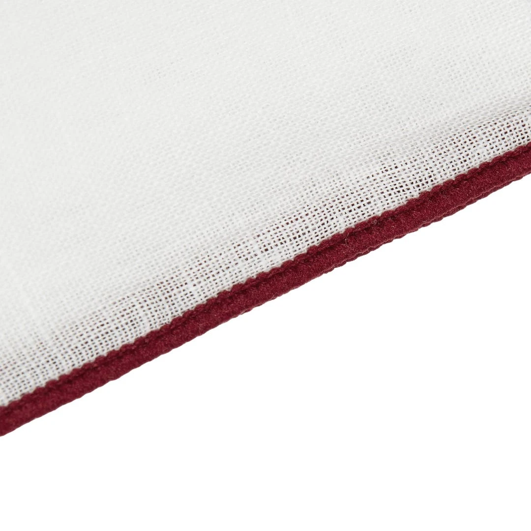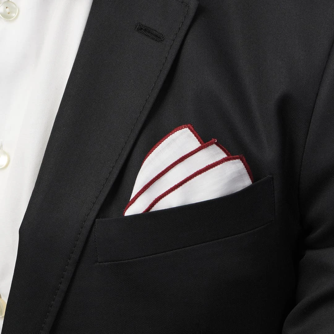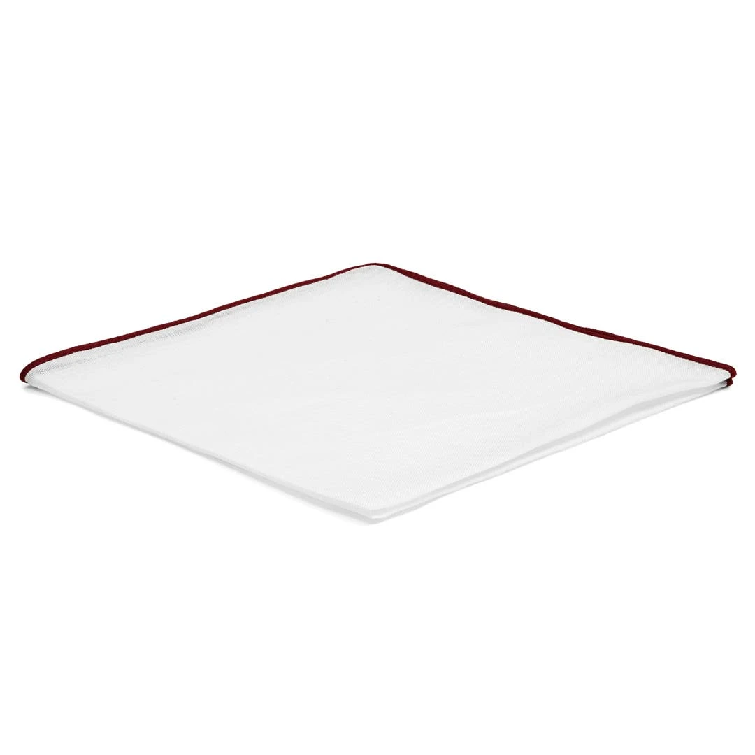Cette pochette de costume en lin blanc virginal est décorée d’un liseré rouge bourgogne des plus élégants.