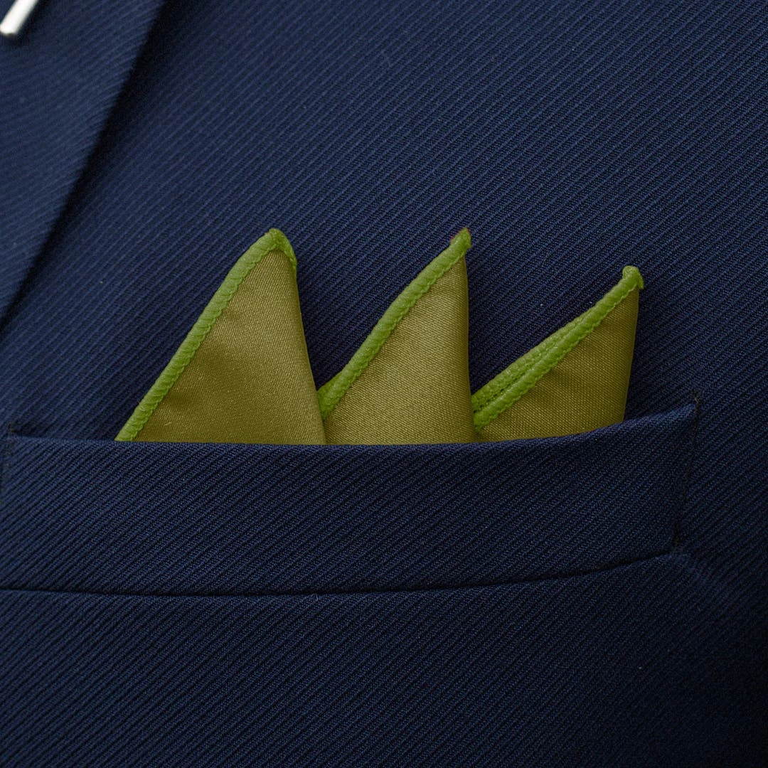 Un mouchoir de poche vert olive apporte de l’apaisement à une tenue foncée et se mariera bien avec un costume marron foncé ou même noir. Vous pouvez aussi oser le total look vert, plus périlleux.