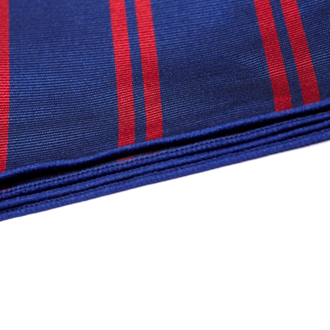 Cette pochette de costume en soie fine arbore d’élégantes rayures rouges sur un fond bleu marine.