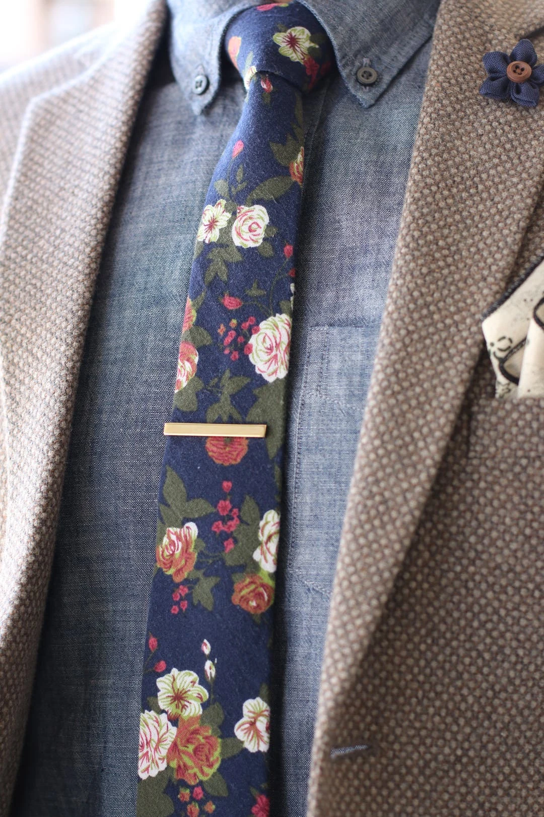 Une pince à cravate dorée adaptée aux cravates étroites ou semi-étroites.